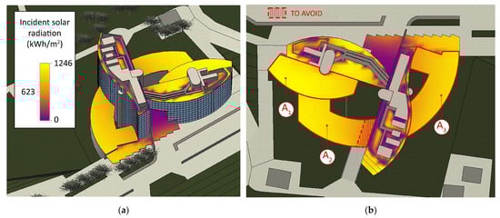 The study of incident solar radiation is carried out through the Insight plug-in present in Revit, which uses the “Perez Solar Model” [39] as a calculation method. The solar model in question is described by Equation (1).