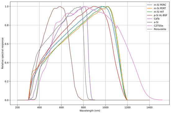 To facilitate direct comparison across diverse PV technologies, these spectral responses were normalized to unity. The resulting normalized spectral response curves for all eight PV technologies are presented in Figure 2, providing a clear visualization of their respective sensitivities to different regions of the solar spectrum. The spectral responses (A/W) of these technologies can be derived from official EQE measurements, using the following relationship: