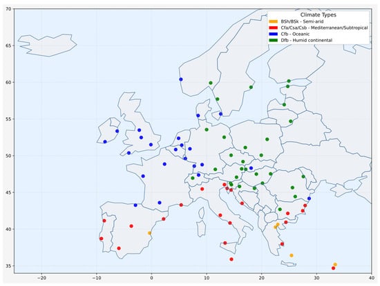 To assess the influence of climatic variations on simulation outcomes, 79 locations across Europe were selected based on the Köppen–Geiger climate classification to encompass a broad geographic and climatic diversity (Figure 3). For countries spanning multiple zones, one representative site per climate category was included to ensure comprehensive coverage of regional meteorological conditions. However, notable exceptions were made for larger countries with extensive latitudinal ranges, where multiple locations within the same climate zone were strategically selected to capture intra-climate variability across latitudes. Sites were grouped into four representative clusters: arid steppe climates (BSh and BSk), temperate zones with seasonal precipitation contrasts (Cfa, Csa and Csb), maritime temperate climates (Cfb), and humid continental climates (Dfb), as detailed in Table 1. This grouping captures key spectral influencers: aridity, Mediterranean seasonality, oceanic cloud regimes, and continental temperature extremes—to systematically evaluate PV performance across Europe’s dominant climate regimes. To evaluate how the climatic diversity across these sites influences PV performance, the analysis shifts to quantifying spectral effects through spectra synthesized from key atmospheric parameters and de-vice-specific responses. First, the average photon energy (APE) is used as a PV-device in-dependent index that quantifies the spectral distribution of solar irradiance by calculating the mean energy per photon, making it particularly useful for comparing spectral variations across different environmental conditions and locations. Its strength lies in providing a single-value metric to assess blue or red shifts in sunlight spectra, enabling straight-forward analysis of spectral impacts on PV performance without requiring technology-specific parameters. It can be written as follows: