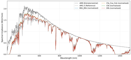 As mentioned earlier, this study conducts a dual analysis of spectral impacts on PV performance through all-sky and clear-sky simulations to address distinct atmospheric regimes and their energy yield implications. The all-sky assessment captures real-world spectral variability across diverse weather conditions—including cloud scattering, aerosol interactions, and seasonal atmospheric composition shifts—enabling annualized quantification of spectral gains/losses under operational environments. Concurrently, the clear-sky analysis isolates spectral behavior during peak production periods, where minimal cloud interference allows direct evaluation of baseline atmospheric drivers (AM, W, AOD) and their technology-specific spectral modulation. This combined approach resolves limitations of prior studies constrained to single-scenario modeling. By integrating both regimes, the analysis advances spectral correction frameworks for energy forecasting. The analysis leverages global spectral data from the National Solar Radiation Database (NSRDB), with Figure 4 demonstrating that annual global irradiance-weighted spectra across all four climate types show enhanced power density in the visible spectrum (400–700 nm) compared to the standard AM1.5 spectrum. All spectra were normalized to the AM1.5 reference at 1050 nm to enable direct comparison of spectral shape variations.