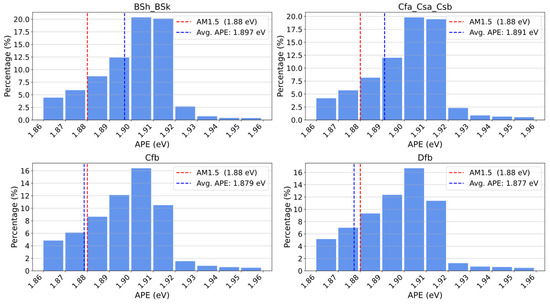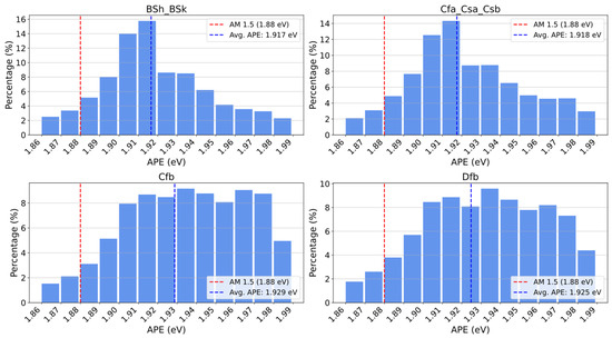 The spectral characteristics of solar radiation, quantified through average photon energy (APE), exhibit distinct patterns across climate groups, with significant implications for PV technology performance. Figure 5 and Figure 6 present the distributions of hourly APE (350–1050 nm) under all-sky and clear-sky conditions for the four climate groups, respectively. The red dashed line marks the reference AM1.5 spectrum (1.88 eV), while the blue dashed line indicates each climate’s mean APE, revealing consistent spectral blue shifts across all regions for all-sky conditions. Analysis of hourly APE distributions reveals that spectra resembling the standard AM1.5 reference (1.88 eV) are exceptionally rare in real-world conditions. Across all four climate groups, only 2–5% of hourly APE values fall within that range. The analysis reveals notable parallels in spectral characteristics between arid (BSh and BSk) and temperate (Cfa, Csa and Csb) climates. Both groups exhibit sharp APE distribution peaks at 1.91–1.92 eV (BSh and BSk: 15.77%; Cfa, Csa, and Csb: 14.33%) and nearly identical averages (BSh and BSk: 1.917 eV; Cfa, Csa, and Csb: 1.918 eV), indicating comparable spectral blue shifts relative to the AM1.5 reference (Δ + 0.037–0.038 eV). The Cfb group demonstrates the highest average APE (1.929 eV), a significant blue shift of Δ + 0.049 eV relative to AM1.5. Its APE distribution spans mostly in area 1.90–1.98 eV with a flat profile (σ = 0.031 eV). Similarly, the Dfb group also exhibits a pronounced blue shift, with an average APE of 1.925 eV (Δ + 0.045 eV above AM1.5). The Dfb distribution is comparably broad and flat, covering the range from 1.90 to 1.98 eV, and features its main peak at 1.93–1.94 eV (9.59% occurrence). This broad and relatively even spread of APE values in both Cfb and Dfb climates highlights a persistent dominance of higher-energy photons throughout the year, reflecting the influence of frequent cloud cover, atmospheric scattering, and regional climatic variability. As a result, spectra closely resembling the standard AM1.5 reference are rare, while blue-shifted conditions prevail in these mid- and high-latitude environments. Under clear-sky conditions, all four climate groups exhibit reduced average photon energy (APE) compared to all-sky scenarios, though with distinct patterns. The maritime temperate (Cfb) and humid continental (Dfb) climates show the most pronounced reductions: Cfb drops from 1.929 eV (all-sky) to 1.879 eV (clear-sky), while Dfb decreases from 1.925 eV to 1.877 eV—even shifting to a red-shifted spectrum relative to AM1.5 (1.88 eV). In contrast, arid (BSh and BSk) and temperate seasonal (Cfa, Csa, and Csb) climates display smaller deviations (BSh and BSk: 1.917 eV → 1.897 eV; Cfa, Csa, and Csb: 1.918 eV → 1.891 eV). This divergence arises from fundamental atmospheric drivers: BSh and BSk and Cfa, Csa, and Csb experience fewer overcast days (<25% annual occurrence), making air mass (AM) and precipitable water (W) the dominant spectral modulators. Coastal sites with high W sustain blue shifts via near-infrared absorption, even under clear skies. Cfb and Dfb locations face frequent overcast conditions (>60% cloudy days), where all-sky spectra are blue-shifted by cloud scattering. However, clear-sky analysis reveals their higher-latitude positioning: elevated AM red-shifts spectra due to increased atmospheric path length, counteracting diffuse-light effects.