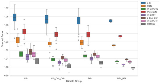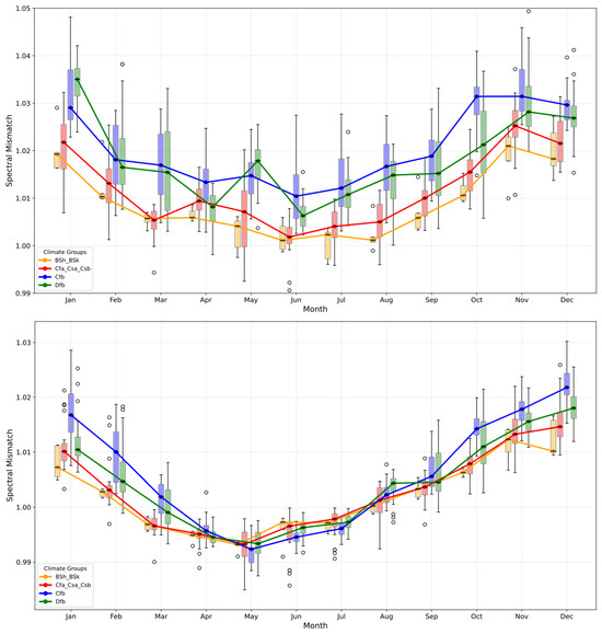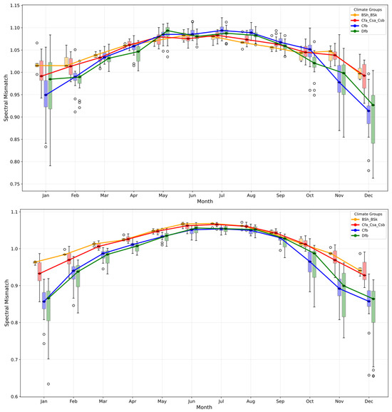 To systematically evaluate irradiance-weighted monthly SF variations across PV technologies, whisker diagrams were selected for two representative types that capture key spectral response characteristics and performance trends. A-Si was selected as the primary thin-film technology for visual representation, with its whisker diagram explicitly shown to illustrate seasonal spectral dynamics. This choice reflects a-Si’s pronounced sensitivity to atmospheric variability, which exemplifies broader thin-film spectral behavior. Perovskite and CdTe technologies exhibit monthly spectral trends closely aligned with a-Si, characterized by similar whisker diagram shapes. However, their whisker diagrams were omitted from visual presentation to avoid redundancy. For crystalline silicon technologies, mono-Si PERC served as the primary representative due to its widespread deployment and spectral stability, with other variants (p-Si, HIT, PERT) discussed textually to highlight minor performance deviations. CZTSSe, which exhibits a monthly whisker diagram shape closely resembling that of crystalline silicon, was also discussed textually rather than shown graphically. The all-sky and clear-sky monthly whisker plots for a-Si across all four climate groups are presented in Figure 10, while mono-Si PERC whisker plots are detailed in Figure 11.