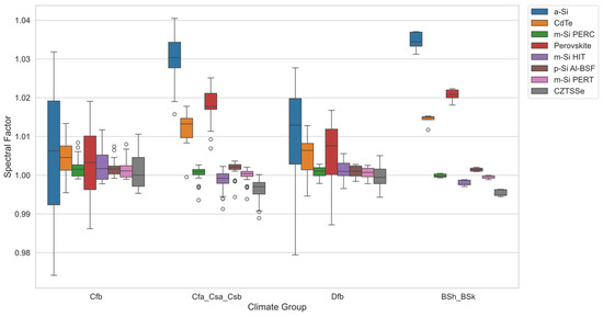 This article presents comprehensive research on the impact of spectral irradiance on PV performance across eight different PV technologies. A total of 79 European locations were analyzed and categorized into four groups based on the Köppen–Geiger climate classification [21,22], similar to the approach taken in the study [23]; however, in that work, only irradiance and temperature were considered as inputs for PV tool comparison against real data, with spectral effects neglected. This study utilized the Fast All-sky Radiation Model for Solar applications with Narrowband Irradiances on Tilted surfaces (FARMS-NIT) to compute one-year solar spectral irradiance data at an hourly scale, providing a detailed understanding of the interplay between spectral conditions and PV efficiency across diverse climatic regions for both all-sky and clear-sky conditions. The results are evaluated to quantify how each technology’s spectral sensitivity interacts with atmospheric drivers such as AM, Kt, W, and aerosol optical depth (AOD). This study further investigates intra-climate spectral variability. While climate zones broadly correlate with spectral behavior, the research reveals significant deviations in spectral mismatch losses (up to 6%) among locations sharing the same climate type, driven by divergent atmospheric parameters. These findings challenge the sufficiency of climate-based categorization alone for spectral optimization, underscoring the need for a revised classification framework. Such a model, building on FARMS-NIT’s parameterized spectral simulations, could enable finer spatial resolution (sub-climate microzones) and improve energy yield predictions.