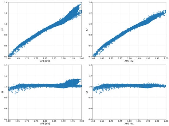 APE versus SF for a-Si (upper panel) and mono-Si PERC (lower panel) for all-sky (left) and clear-sky (right) conditions.
