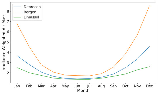 Irradiance-weighted AM for locations with minimum (Limassol, Cypruss), maximum (Bergen, Norway), and median latitudes (Debrecen, Hungary).