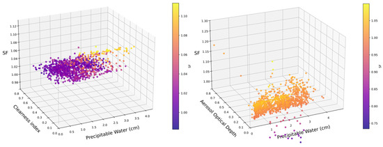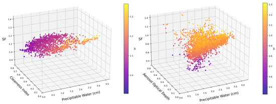 To quantify the influence of atmospheric variables on spectral variability, 12 representative locations were analyzed—three sites from each climate group. For all-sky conditions, the clearness index (Kt), defined as the ratio of surface horizontal irradiance to theoretical clear-sky surface horizontal irradiance, and precipitable water (W) were prioritized. Kt captures cloud modulation of spectral distribution, while W governs atmospheric absorption in near-infrared bands (900–1100 nm). Under clear-sky conditions, aerosol optical depth (AOD) and W are taken as dominant variables, as AOD dictates scattering-induced spectral shifts in the visible range (400–700 nm) and W maintains its infrared absorption role. The 3D scatter plots of hourly values of SF compared to atmospheric parameters in Figure 13 (a-Si) and Figure 14 (mono-Si PERC) quantitatively contrast spectral sensitivity between thin-film and crystalline silicon technologies. For a-Si, the plots reveal a wide dispersion of spectral factor (SF) values across the atmospheric parameter space—clearness index (Kt and W for all-sky conditions, and AOD and W for clear-sky conditions. This broad distribution underscores a-Si’s heightened sensitivity to atmospheric variability. Conversely, mono-Si PERC exhibits minimal SF fluctuations across identical atmospheric gradients, forming tightly clustered data points in Figure 14. This stability persists under both all-sky and clear-sky regimes due to PERC’s broadband spectral response (350–1200 nm), which dilutes the impact of variables Kt, W, and AOD.