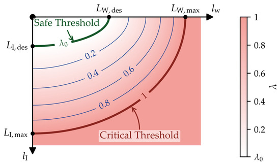 In Figure 3, the vertical axis and horizontal axis represent the ice load and wind load, respectively. Here, and denote the safe threshold and critical threshold of ice load that the overhead transmission line can withstand; and are the corresponding thresholds for wind load. The green curve in the figure represents the safe boundary of the ice–wind load, defined as an ellipse determined by and . When the ice–wind load vector falls within this ellipse, the failure rate of the line remains at a relatively low level, denoted by λ0. The red curve denotes the limit boundary, also an ellipse, determined by and ; if the ice–wind load falls outside this ellipse, the line is considered to fail with certainty [25]. The thin blue lines in the figure are iso-failure-rate curves, while the red background gradient indicates the magnitude of the failure rate, with darker shades representing higher failure rates.