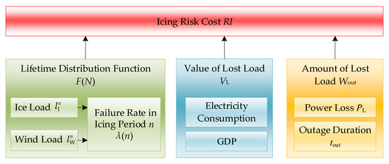 The risk quantification model is illustrated in Figure 5, where the model output is the icing risk cost RI of the overhead transmission line, defined as
