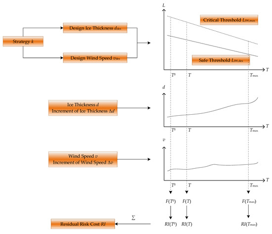 where Tmax denotes the evaluation period for the anti-icing strategy’s performance. Its value can be determined based on the maximum effective duration among all anti-icing schemes within the strategy, the least common multiple of their durations, the lifetime of the transmission line, or the enterprise planning horizon. Cm(km, T) represents the present value of the investment cost in year T for line m when adopting anti-icing scheme km; RIm(km, T) denotes the present value of the residual risk cost in year T for line m under scheme km. The residual risk cost refers to the quantified risk cost that remains over time even after an anti-icing scheme has been implemented.