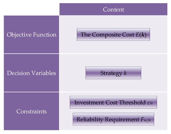 In the method described in [35], the anti-icing scheme for a transmission line was determined based on the relationship between the service age of the line (as shown in Table 1) and the Weibull distribution curve. Specifically, the maintenance scheme was applied during the steady period of the Weibull curve, the reform scheme was applied in the first 50% of the wear-out phase, and the reconstruction scheme was applied in the latter 50% of the wear-out phase. In [36], a health index was defined for each line, and the anti-icing scheme was selected based on the value of this index. When the health index fell within [80, 100], the maintenance scheme was adopted; when it fell within [50, 80), the reform scheme was selected; and when the health index was below 50, the reconstruction scheme was implemented.