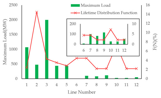 By substituting ddes and vdes from Table 2, as well as the meteorological data from Table 3, into Equations (3) through (11), and taking λ0 = 0.004 [32], the failure rates of Line 2 during the four icing periods were calculated as 11.82%, 3.03%, 0.4%, and 0.4%, respectively. Using Equation (2), the lifetime distribution function value of Line 2 under the combined effect of four icing periods (N = 4) was calculated to be 14.49%. According to the latest data from the 2023 China Statistical Yearbook and using Equation (13), the VoLL in the region was determined to be 15.697 CNY/kWh. By substituting the above data into Equation (12), the icing risk cost of Line 2 during the period from December 2023 to February 2024 was calculated to be CNY 39.13 million. The lifetime distribution function values and maximum loads of all lines under four icing periods (N = 4) are shown in Figure 8.