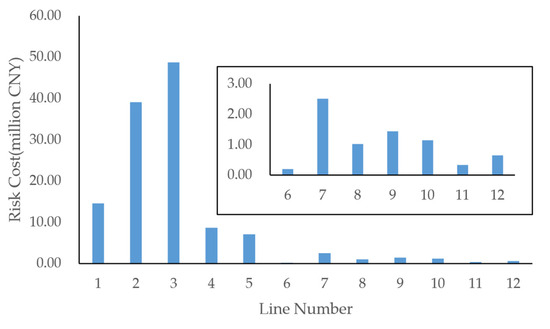 As shown in Figure 9, the icing risk costs of Line 2 and Line 3 are significantly higher than those of the other lines, but for different reasons. For Line 2, certain sections pass through areas with severe icing conditions, resulting in a much higher lifetime distribution function value compared to other lines, which in turn leads to a higher icing risk cost. Although Line 3 has a moderate lifetime distribution function value, its maximum load is significantly higher than that of the other lines, contributing to its elevated risk cost.