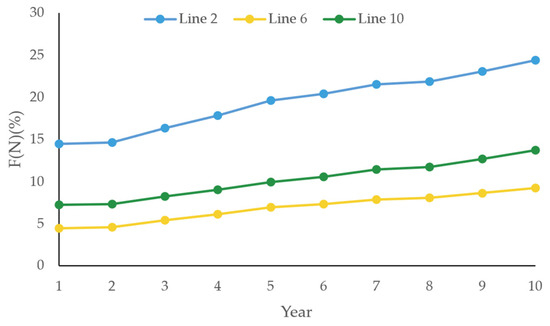 In Equation (23), the variable was set to 1% of the safe threshold of the ice–wind load that the overhead transmission line can withstand. In Equation(24), ∆Lmax(km, T) was set to 1% of the critical threshold of the ice–wind load. According to relevant regulations [34], the discount rate r used in Equations (17) and (18) was set to 8%. As an illustration, Figure 10 shows the year-by-year lifetime distribution function values under the time evolution model for Line 2, Line 6, and Line 10. Given the similar trends across multiple curves, plotting all data would result in excessive visual clutter. Therefore, representative curves were selected for display.