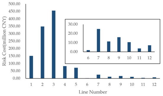 By comparing Figure 12 and Figure 13, it was observed that although Line 9 has the lowest residual risk cost under the reconstruction scheme, the high implementation cost of reconstruction results in a higher composite cost compared to the reform scheme. Therefore, the optimal anti-icing scheme for Line 9 is the reform scheme. According to Equation (25), the optimal anti-icing strategy for each line is the scheme that yields the lowest composite cost while satisfying both the economic and reliability constraints. The optimal anti-icing scheme and corresponding cost values for each transmission line are summarized in Table 6.