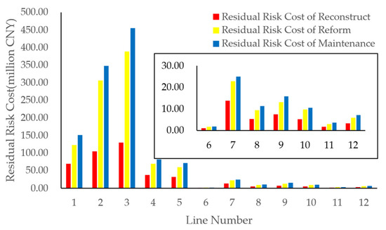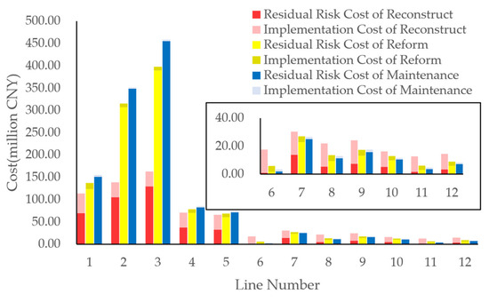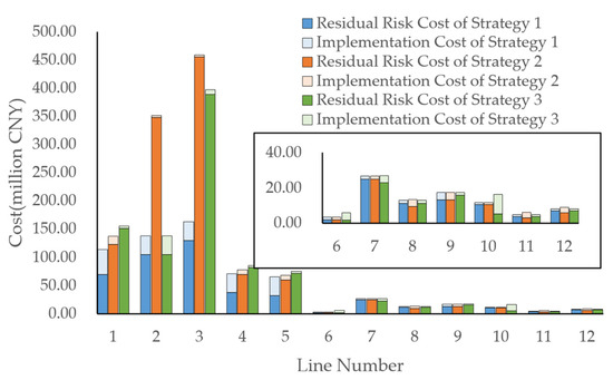 In Figure 12, the sum of the residual risk cost and the implementation cost under each strategy represents the composite cost of the selected anti-icing scheme for each transmission line.