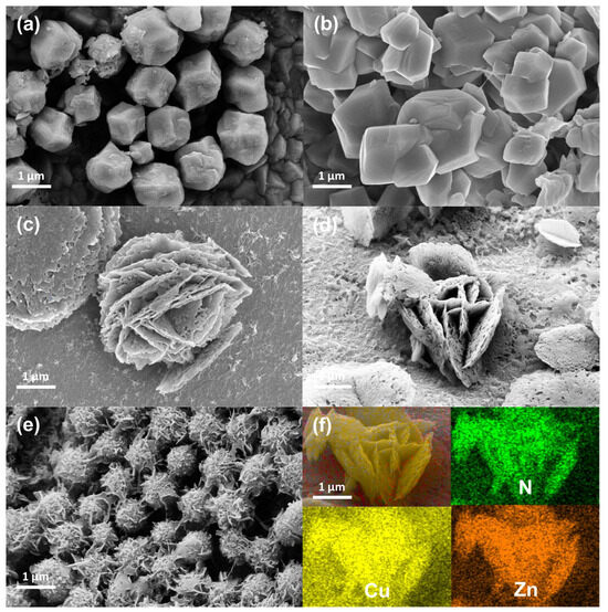 SEM images of (a) Zn-ZIF/NF, (b) Cu0.3Zn0.7-ZIF/NF, (c) Cu0.5Zn0.5-ZIF/NF, (d) Cu0.7Zn0.3-ZIF/NF, and (e) Cu-ZIF/NF; (f) EDS elemental mapping images of Cu0.7Zn0.3-ZIF/NF.