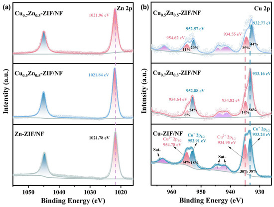 XPS spectra of each CuxZn1-x-ZIF/NF catalyst: (a) Zn 2p; (b) Cu 2p.