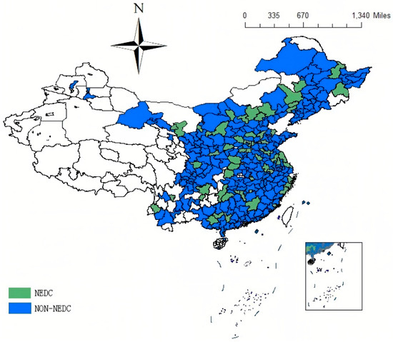 Considering that China’s Renewable Energy Law, implemented on 1 January 2006, may have an impact on policy evaluation. This study uses cities at the prefecture level and above in China from 2006 to 2022 as the analytical sample. Moreover, since the datasets of certain cities, including Lhasa, Kunyu, Sansha, and Danzhou, suffered from extensive data deficiencies, the research ultimately settled on 284 city samples. Among them, 58 were part of the pilot program, while the remaining 226 were non-pilot cities. The specific spatial distribution is shown in Figure 1. The NEDC list was obtained from the official website of the National Energy Administration (https://zfxxgk.nea.gov.cn/ accessed on 12 February 2025). Data were acquired from the China Urban Statistical Yearbook and the China Open Data Platform. To address data gaps, linear interpolation was employed for supplementation.