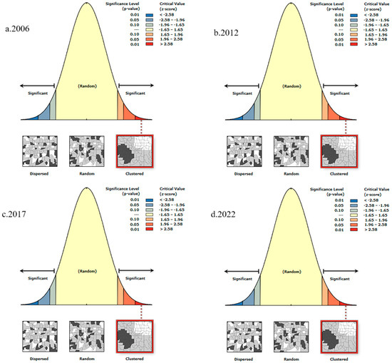 Spatial auto-correlation analysis is a critical approach for examining the spatial distribution characteristics of socioeconomic activities, capable of revealing their agglomeration and dispersion patterns. This research utilizes ArcGIS10.8.1 software alongside Global Moran’s I statistics to conduct a comprehensive analysis of spatial auto-correlation in urban IGG. As illustrated in Figure 2, the significance test results of the global Moran’s I indices for urban IGG in 2006 (a), 2012 (b), 2017 (c), and 2022 (d) show significant positive spatial correlation (p < 0.05). Specifically, the spatial polarization pattern—where high-value areas cluster with high-value areas (HH agglomeration) and low-value areas cluster with low-value areas (LL agglomeration)—persists. This phenomenon highlights significant spatial dependence in urban IGG. Although the intensity of spatial agglomeration fluctuates over time, the overall spatial structure remains stable.