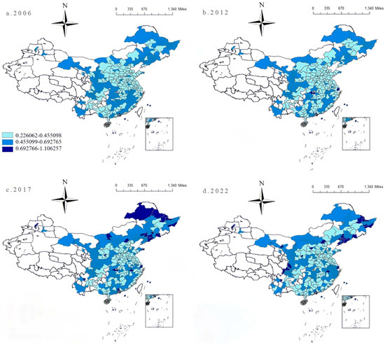 Using natural breaks classification in GIS, IGG levels are categorized into three tiers. Spatial distribution patterns of urban IGG in 2006, 2012, 2017, and 2022 are shown in Figure 3. It shows IGG at the municipal level is generally on the rise. Specifically, 135 cities were in the [0.226062, 0.455098] range in 2006, accounting for 47.5% of the total sample size; 4 cities were in the range of [0.692766, 1.106256], accounting for 1.4%. By 2022, cities in the lowest tier decreased to 112, accounting for 39.4 percent, and those in the highest tier increased to 33, accounting for 11.2%.