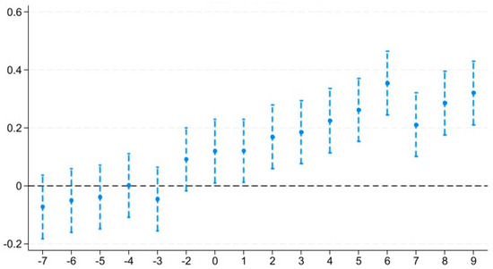 The difference-in-differences (DID) method hinges on the parallel trend requirement, stipulating that treatment and control groups must show no significant pre-policy divergences. An event study framework validated this assumption empirically, complemented by an analysis of the policy’s dynamic effects [48]. The expression is as follows: