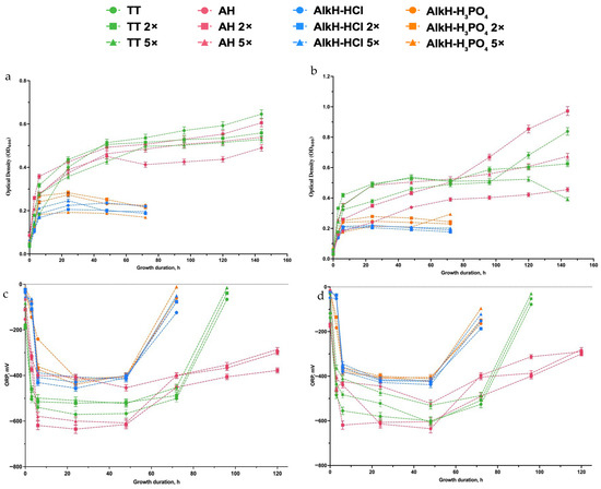 Impact of different pretreatment methods on growth and ORP changes during batch growth of E. coli using sunflower husk hydrolysates. Growth was measured by optical density (OD600) for 50 g L−1 (a) and 75 g L−1 (b) SH, ORP changes expressed in mV over time for 50 g L−1 (c) and 75 g L−1 (d) SH concentrations, respectively. Treatments include thermal (TT), acid (AH), and alkaline hydrolysis with HCl (AlkH-HCl) or H3PO4 (AlkH-H3PO4), each at different dilutions (0×, 2×, and 5×). Cells were grown at 37 °C under anaerobic conditions. Data points represent the mean ± SD from triplicate experiments (n = 3). Statistical details are provided in the Section 2.