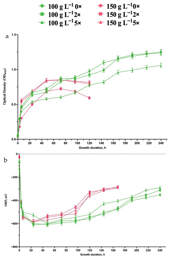Growth (a) and ORP changes (b) during batch growth of E. coli using 100 g L−1 and 150 g L−1 SH hydrolysates at different dilutions (0×, 2×, and 5×). Data represent the mean ± SD from triplicate experiments (n = 3). For further details, refer to the Section 2.