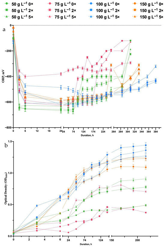 Growth (a) and ORP changes (b) during batch growth of E. coli using different SH concentrations (50–150 g L−1) at various dilutions (0×, 2×, and 5×) with co-fermentation on 10 mL L−1 glycerol. Data represent the mean ± SD from triplicate experiments (n = 3). For statistical analysis, refer to the Section 2.