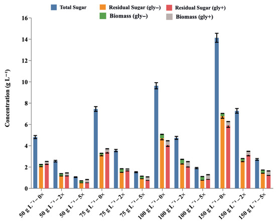 Sugar consumption and biomass generation of E. coli during batch fermentation of SH hydrolysate at different dilutions (0×, 2×, and 5×) either in the absence (gly−) or presence (gly+) of glycerol. The x-axis shows experimental conditions with varying substrate concentrations (50, 75, 100, and 150 g L−1) and dilution factors. The blue bars indicate the initial total sugar concentration prior to fermentation, while the orange and red bars represent the remaining sugar content under Gly− and Gly+ conditions, respectively. Biomass production after fermentation is shown by the green bars for Gly− and gray bars for Gly+ conditions. Data are presented as mean ± SD from triplicate experiments (n = 3).