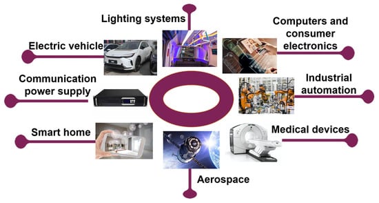 SMPSs have emerged as the predominant power supply solution for modern electronic devices, finding widespread applications in communication systems, renewable energy systems, and consumer electronics, as illustrated in Figure 1 [1,2].