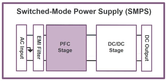Figure 2 shows the typical structure of an SMPS, consisting of a former AC/DC stage followed by a latter DC/DC stage. The front stage converts the AC to high-voltage DC and dynamically adjusts the input current waveform to make the PF close to 1 to achieve power factor correction (PFC). DC/DC converts the high-voltage DC of the previous stage to isolated and stable low-voltage DC. This design takes into account high efficiency, power factor correction and stable output [3,4].