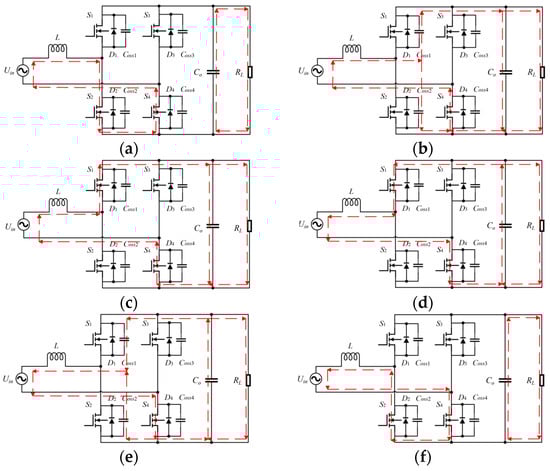 Working mode of totem-pole bridgeless PFC circuit: (a) Stage I [t0, t1]; (b) Stage II [t1, t2]; (c) Stage III [t2, t3]; (d) Stage IV [t3, t4]; (e) Stage V [t4, t5]; (f) Stage VI [t5, t6].