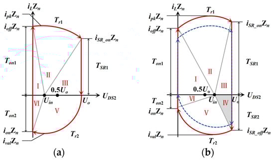 When Uin ≤ 0.5Uo, as shown in Figure 5a, in stages I, III, and VI, the homogeneity of the inductance current increases or decreases. During stages II and V, the inductance resonates with the switch junction capacitance. This resonance reduces UDS2 to 0, enabling natural ZVS of the power switch. When Uin > 0.5Uo, an additional TCM-controlled stage IV must be incorporated, as illustrated in Figure 5b, to achieve full-range ZVS operation. The red arrow trajectories in this figure represent the normal operating paths under respective conditions, while the blue arrow trajectory in Figure 5b indicates the critical path that just achieves ZVS in TCM.