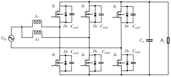 Figure 3 shows the topology of the totem-pole bridgeless PFC. Uin denotes the input voltage; L represents the boost inductance; D1 and D2 are the body diodes of the high-frequency switches S1 and S2, respectively; and Coss1 and Coss2 (where Coss1 = Coss2 = Coss) are the junction capacitance of S1 and S2, respectively. S3 and S4 are power frequency switches, Co is the output filter capacitance, and RL is the load resistance. Figure 3 shows the operation mode of the circuit in a high-frequency switching cycle with a positive power frequency half cycle. Figure 4 shows the corresponding characteristic waveform.