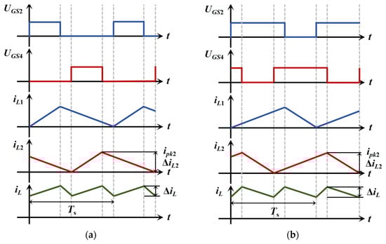 The waveforms of the switch voltage signal and inductance current of each interleaved parallel branch when duty cycle D ≤ 0.5 and D > 0.5 are shown in Figure 7. The voltages and driving signals of the two modules exhibit a half-cycle phase difference during the positive half-cycle period. The two inductive currents also have a phase difference of half a switching cycle. By superimposing two groups of inductive currents, the total inductive current iL is obtained. From the figure, the total current ripple value ΔiL is significantly reduced.
