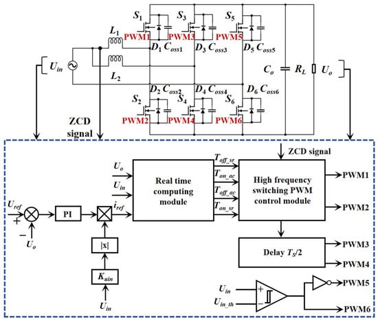 Therefore, Ref. [16] integrated the TCM control with interleaving technology, achieving full-range ZVS while further reducing the inductor current ripple, with a peak efficiency of 96.9%. However, this approach requires coordinated control between a DSP and FPGA. Similarly, even for single-phase TCM control, the implementation in ref. [17] necessitates combined DSP and CPLD control. Furthermore, the control scheme in ref. [24] requires additional sampling of the actual inductor current value, which increases system complexity in terms of current sensing.