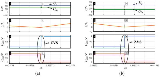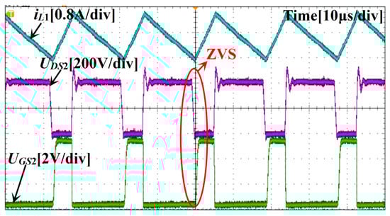 According to the plane trajectory curve of the iLZn-UDS2 state in Figure 5, TCM control is not necessary when Uin ≤ 0.5Uo. When the inductance current drops to 0, the rectifier tube is not required to extend the conduction time, and the system can realize ZVS naturally. Therefore, it is essential to test the implementation of ZVS with TCM control when Uin > 0.5Uo. If ZVS can still be realized in this case, it can be further considered that the circuit can realize ZVS in the full operating range.