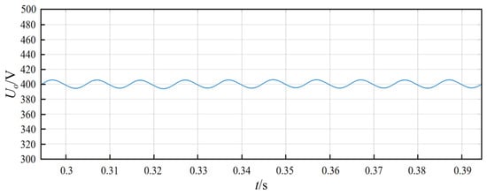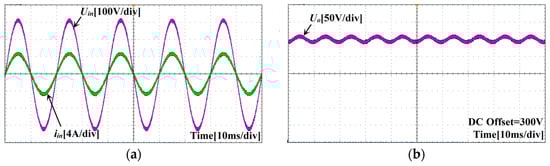 Figure 21a shows the measured input voltage and current waveforms. The iin filtered by the LC circuit is sinusoidal and in phase with the Uin, realizing the power-factor-correction function of the circuit. Figure 21b shows the measured output voltage waveform at full load at 220 VAC. To better visualize the ripple characteristics of Uo, the oscilloscope’s central axis was calibrated to represent a 300 V DC offset voltage reference during measurements. The Uo is stable at 400 V, and the voltage ripple is ≤5% Uo, which is 20 V.