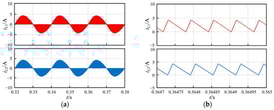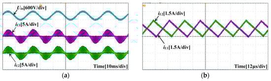 Figure 17a,b are the overall and amplified waveforms of the inductance current of the main phase and the slave phase, respectively. The inductance current waveforms of the two branches are presented in a staggered manner based on the same phase of the outer contour. The phase difference is half of the switching cycle, and the waveform characteristics maintain good consistency.