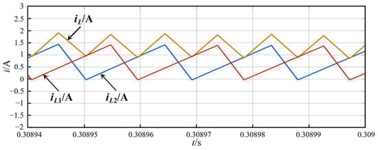 Figure 18 shows the waveforms of the branch current and total inductance current of two inductors. The branch inductor current exhibits a period of approximately 19.077 μs, with an intercurrent phase difference of about 9.522 μs, corresponding to half the current period. The ripple of the iL is about 1 A, and the ripple of the one-phase inductance current is about 1.5 A. It can be seen that the ripple of the total inductance current after interleaving control is less than that of the inductance current of any branch, which thoroughly verifies the ripple-cancellation effect of the interleaving parallel technology based on TCM and proves the effective integration of the improved control technology.