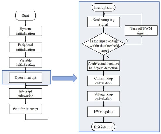 Figure 19 is the prototype of the designed totem-pole bridgeless PFC. Based on the system control framework constructed in Figure 10, the overall program flow chart of digital control software for the circuit is shown in Figure 20. The main program is mainly responsible for initializing and setting the system, peripherals, and variables. After completing the configuration, initialize all modules, activate the timer, and wait for interruption.