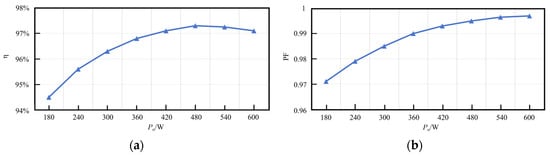 The input voltage and current were connected as one channel pair, while the output voltage and current were connected as another channel pair to the power analyzer, enabling direct measurement of input power Pin, output power Po, and apparent power S. These measurements allowed the subsequent calculation of both the circuit efficiency η and power factor PF. Figure 24a shows the efficiency η of the prototype. The peak efficiency is 97.3%, and the efficiency at full load is 97.1%. Figure 24b shows the PF of the circuit. Under rated operating conditions, the converter maintains a PF above 0.99, thereby achieving power factor correction functionality.