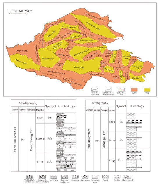 The Junggar Basin is located in the northern part of the Xinjiang Uyghur Autonomous Region of China, and it is one of the large composite oil and gas basins in western China’s land area [35,36]. The total area of this basin exceeds 13 × 104 square kilometers. The geological structure is characterized by multi-level differentiation features, mainly composed of six first-level structural units including the western uplift belt, central depression belt, and land bridge uplift belt. It is further divided into 44 s-level structural units, such as the Mahu Depression, Xiayan Uplift, Dabasong Uplift, Zhongguai Uplift, Shawan Depression, Pen1 Well West Depression, Shixi Uplift, Mobei Uplift, Dongdaohaizi Depression, and Fukang Depression. The regional structural layout shows significant spatial differentiation laws, with first-level uplift belts and depression belts alternating in distribution, and secondary uplift structures and depression units showing adjacent coexistence, forming a complex structural landform combination system (Figure 1). Since the Carboniferous period, the deep structure of the basin has undergone multiple stages of evolution under the effect of four tectonic movements in the Hercynian, Indosinian, Yanshan, and Himalayan periods: during the early Permian, a rift basin structural system developed; in the middle Permian, it transformed into a foreland basin structural background; and from the late Permian to the Triassic, it entered the stage of depression basin evolution. From the Carboniferous to the middle Permian, the internal structure of the basin was controlled by the uplift–depression structural pattern, and each secondary unit formed independent sedimentary systems; starting from the late Permian structural transformation period, a unified subsidence center gradually developed in the central and southern parts of the basin, ultimately achieving the integration of the lake system across the entire basin, marking a major transformation from differentiated to integrated sedimentary patterns [37,38]. The basin developed from Carboniferous to Quaternary, including Carboniferous, Permian, Triassic, and Quaternary strata, with relatively complete strata, and sediment thickness can exceed 7000 to 9000 m, with differences in the distribution range of different strata [39,40,41]. It has significant zonality in plain view, with the Jiamuhe Formation (P1j), Fengcheng Formation (P1f), Xiazijie Formation (P2x), and Xiawuerhe Formation (P2w) developing in the western and central parts, and the Lucaogou Formation (P2l) being characteristic of the eastern part, while the Shangwuerhe Formation (P3w) exhibits a distribution pattern covering the entire basin. Significant differences in burial depth are observed vertically, with deep to ultra-deep reservoir systems dominating below 4500 m, accounting for more than 60% of the total reservoir thickness. The source rock system developed multi-layer source rock systems vertically from Carboniferous to Triassic, with six effective source rock formations being identified. Among these, the Permian source rocks have the best quality and the widest distribution, represented by the Fengcheng Formation, Xiawuerhe Formation, and Lucaogou Formation, with high organic richness and large hydrocarbon generation potential, forming the core material foundation for the basin’s oil and gas reservoir formation [42]. There was a large amount of hydrocarbon generation and expulsion over multiple evolutionary stages through successive multiple-reservoir formation periods, including the Middle to Late Permian, Late Triassic, and Middle Jurassic to Early Cretaceous [43], providing sufficient sources for reservoir formation. The Jiamuhe Formation of the Permian mainly consists of volcanic rocks and volcaniclastic rocks, while the reservoir rocks of the Xiazijie Formation, Xiawuerhe Formation, Shangwuerhe Formation, Fengcheng Formation, and Lucaogou Valley Formation are mainly composed of fluvial–deltaic clastic rocks. Mixed rocks and carbonates developed in local areas, such as the Fengcheng Formation in the Mahu Depression and the eastern part of the Lucaogou Valley Formation in the Fukang Depression.