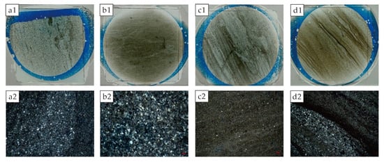 In terms of lithological development, the Lucaogou Formation is characterized by thick layers of conglomerate intercalated with thin layers of mud shale, locally containing oil shale and calcareous cement zones, with high proportions of coarse clastics, and conglomeratic structures, often volcanic rock fragments mixed with terrigenous gravels, reflecting a rapid filling process near the source under an active tectonic background, with sample lithologies including calcareous siltstone (Figure 2(a1–b2)), siltstone (Figure 2(c1,c2)), and silty dolomite (Figure 2(d1,d2)). The Fengcheng Formation conglomerate series is thin and stable, with frequent interlayering of ash layers with mudstone, siliciclastic rock, and volcanic event layers coupled with chemical deposition, reflecting the dynamic equilibrium of volcanic–hydrothermal–sedimentary processes during the lake basin expansion period, with sample lithologies including clayey shale (Figure 3(a1,a2)), clayey feldspathic shale (Figure 3(b1,b2)), feldspathic shale (Figure 3(c1,c2)), and silica shale (Figure 3(d1,d2)). The fundamental difference between the two is rooted in the ancient geographical setting; the Fengcheng Formation was formed in a semi-deep water basin, away from the main source, with active volcanic activity, while the Lucaogou Formation is located in the steep slope belt at the basin’s edge, controlled by strong tectonic uplift and coarse clastic alluvial systems, leading to differences in its conglomerate types and preservation conditions compared to the Fengcheng Formation.