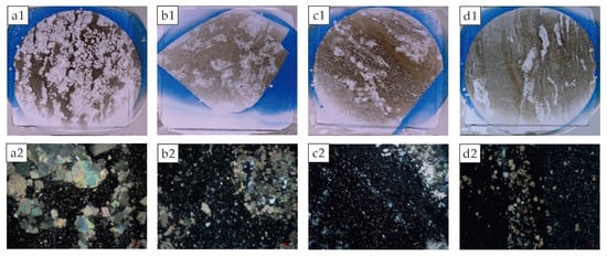 Lucaogou Formation: thin sections of rock and microscopic characteristics ((a1): quartzose siltstone, block conglomerate; (a2): composed of fine sedimentary particles and calcite crystals; (b1): quartzose siltstone, block conglomerate; (b2): composed of fine sedimentary particles and calcite crystals; (c1): siltstone, layered conglomerate; (c2): composed of dolomite crystals; (d1): silt-bearing dolomite, layered conglomerate; (d2): composed of fine sedimentary particles and calcite crystals).