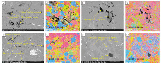 Pore type characteristics of the Lucaogou Formation and Fengcheng Formation ((a1). Intergranular dissolution pores and organic matter; (a1,a2) in situ energy spectrum; (b1) intercrystalline pores; (b1,b2) in situ energy spectrum; (c1) intergranular dissolution pore, dissolution fractyres and organic matter; (c1,c2) in situ energy spectrum; (d1) intergranular pores and organic matter; (d1,d2) in situ energy spectrum).
