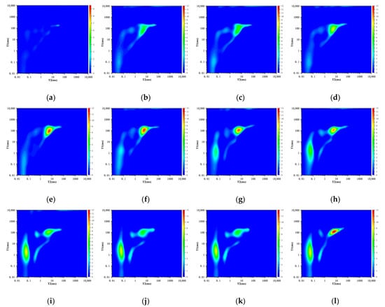 Alternating gradient NMR oil–water distribution changes ((a) initial oil-drying; (b) adsorption 24 h—oil; (c) adsorption 48 h—oil; (d) adsorption 96 h—oil; (e) adsorption 480 h—oil; (f) adsorption 484 h—water; (g) adsorption 504 h—water; (h) adsorption 552 h; (i) adsorption 696 h—water; (j) adsorption 960 h—water; (k) adsorption 1056 h—oil; (l) adsorption 1104 h—oil).
