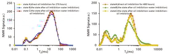 Nitrogen adsorption experiments show that the study area is dominated by slit-shaped pores (Figure 6), and ink-bottle shaped pores are not developed. Therefore, theoretically, the wettability hysteresis effect has little influence on the study area. To further confirm this understanding, we compared the nuclear magnetic resonance (NMR) signals of direct oil absorption (state A) and the state after oil imbibition–water imbibition–oil imbibition (state C). If wettability hysteresis occurred, state B would exhibit more water signals than the normal wetting state [46]. However, we found that the NMR signals of most samples in state C were not significantly different from those in state A, allowing for the wettability study in this work to ignore the influence of wettability hysteresis (Figure 7).