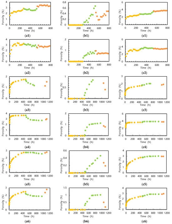 Alternating permeability changes in the Lucaogou Formation and Fengcheng Formation (Yellow is the oil absorption phase 1, green is the water absorption phase, and orange is the oil absorption phase 2 (a1)–(c2), Lucaogou Formation; (a3)–(c6) Fengcheng Formation).