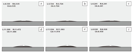 Typical sample wetting angle characteristics ((a–c), Lucaogou Formation; (d–f) Fengcheng Formation).